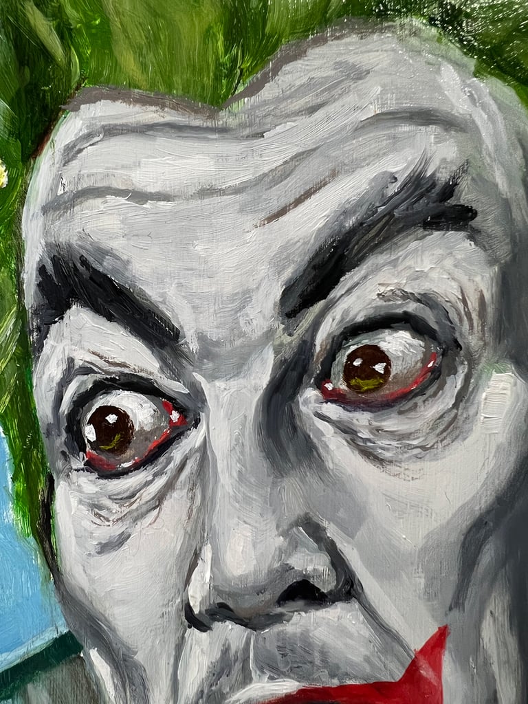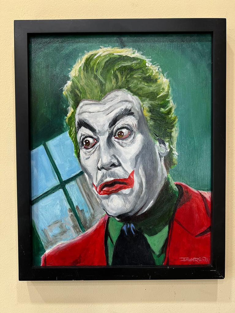 Here is the first of my planned "Joker" portraits. This is an original painting of Caesar Romero portraying his raucous version of the Caped Crusader's greatest nemesis. I was always fascinated by the trivia regarding his mustache. For those not in the know, Caesar had a reputation for playing Latin lovers in many films. The mustache had become his signature. The solution was to simply paint white makeup over it! Not a single person noticed or cared! Holy Bat Legends!